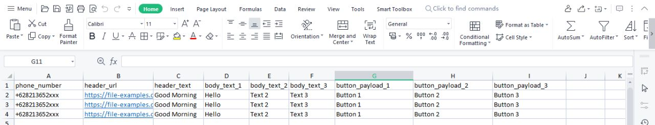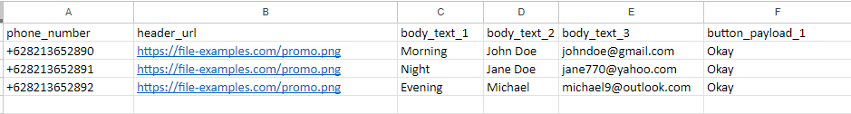 The following is an example of using an XLSX file for a broadcast recipient: