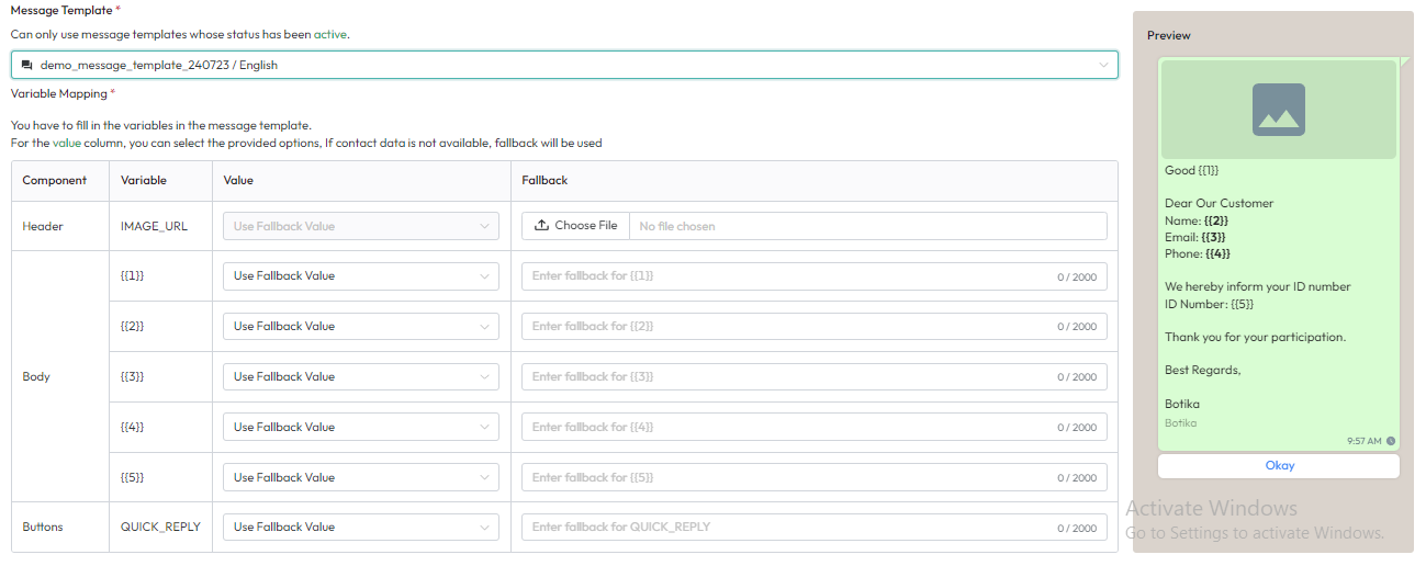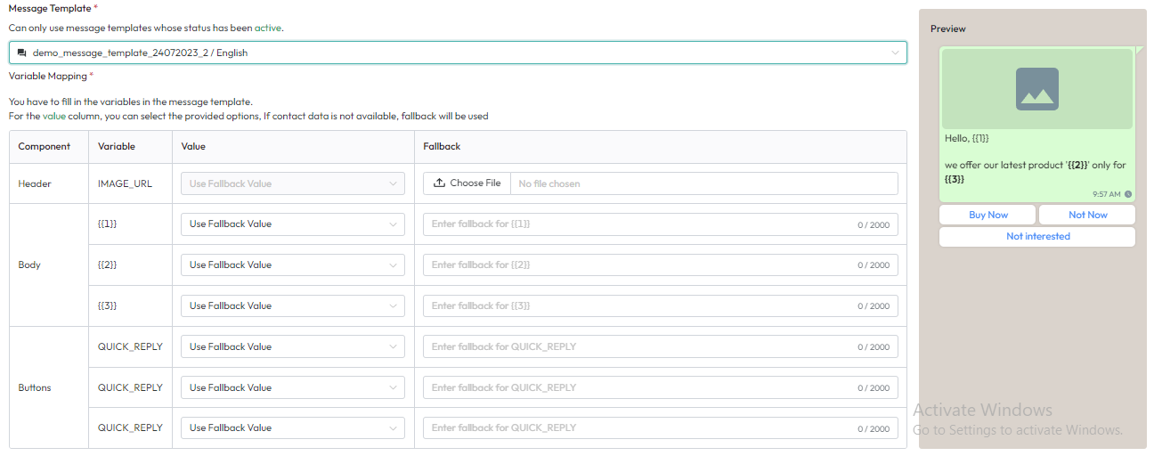 - Select the message template to be used.