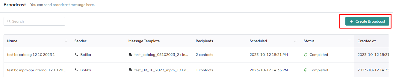 - Go to the Broadcast page by clicking from the left-side navigation, and click + Create Broadcast on the top right of the page.