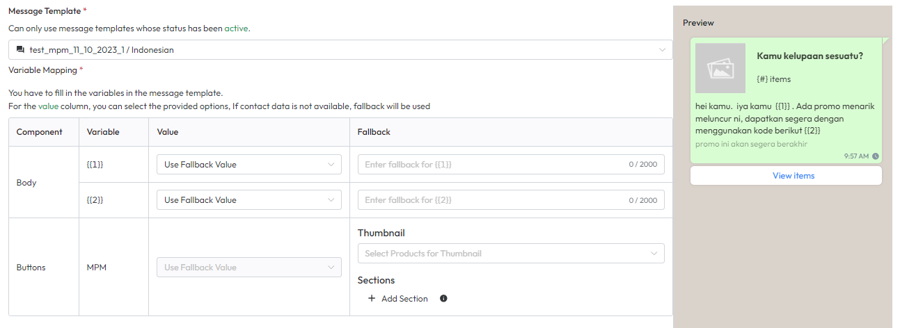 - Next, select the message template you want to use. Only message templates with an 'active' status can be used. If the selected message contains variables, you need to fill in all of these variables. You can fill them with contact data for certain variables. You can also fill in the fallback used.